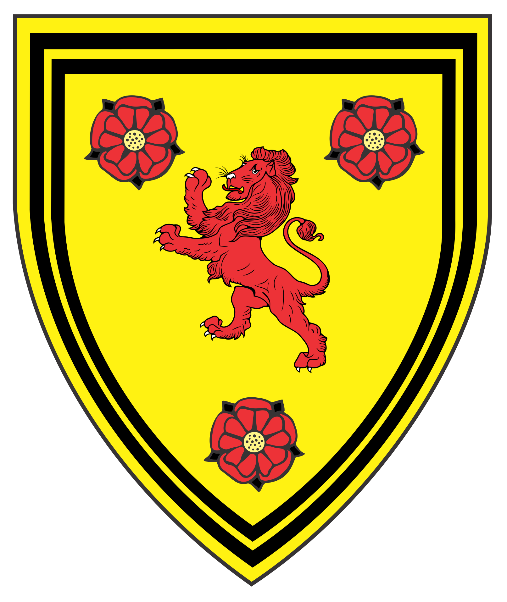 Or, a lion gules between three roses gules barbed sable seeded Or, a double tressure sable.