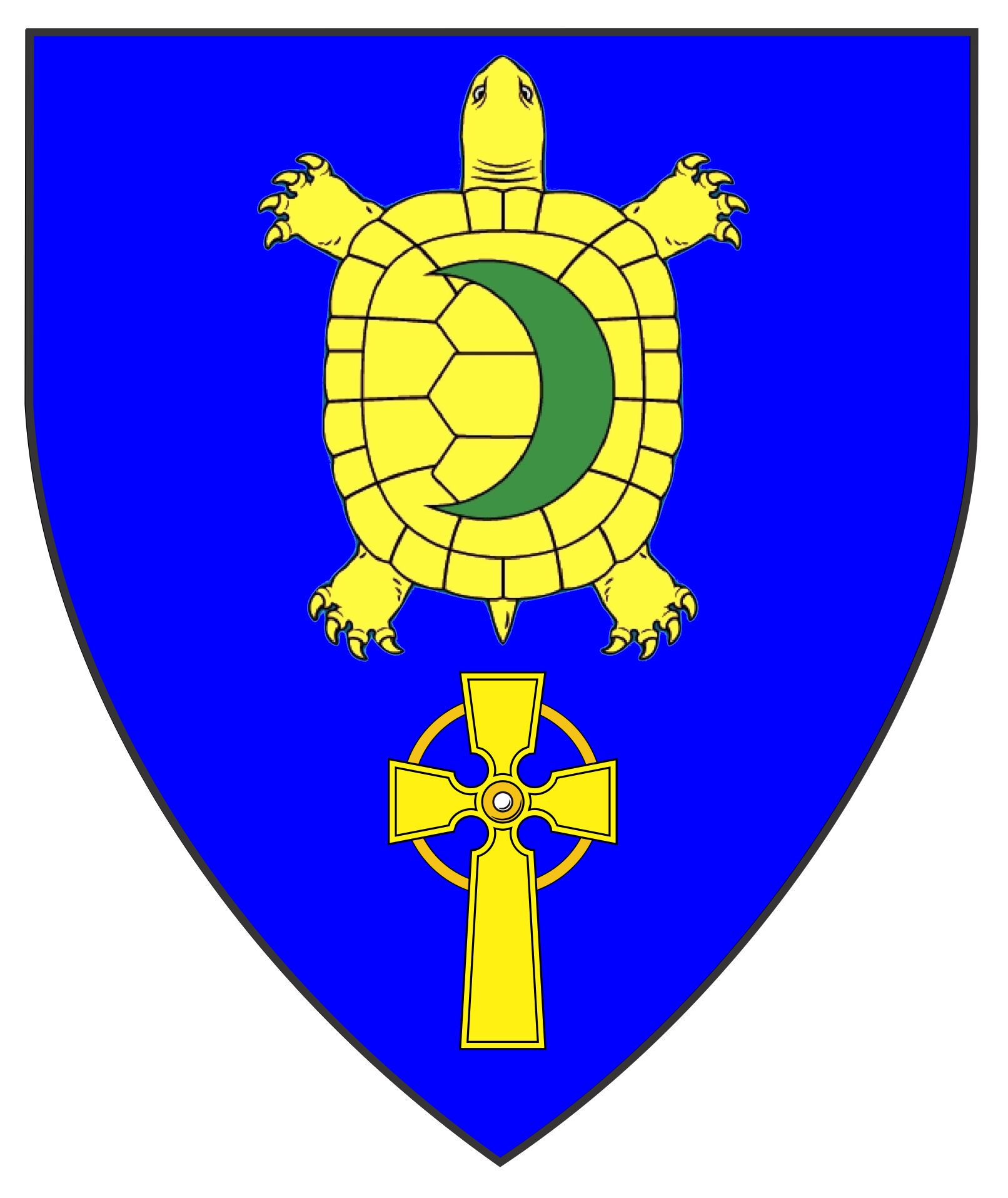Azure, a tortoise Or charged with an increscent vert, in base a Celtic cross Or.