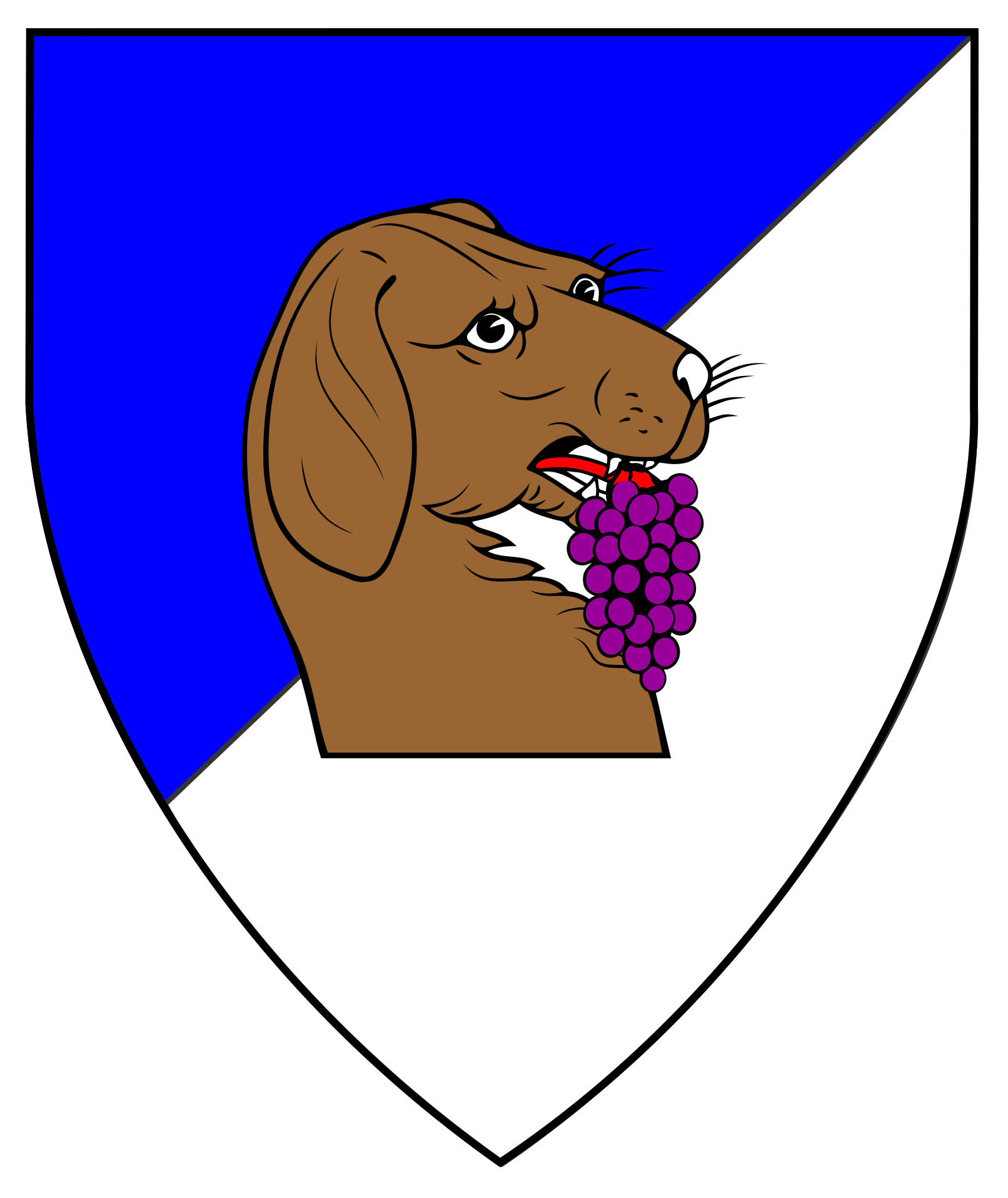 Per bend sinister azure and argent, a brown talbot's head couped contourny maintaining a bunch of grapes proper.