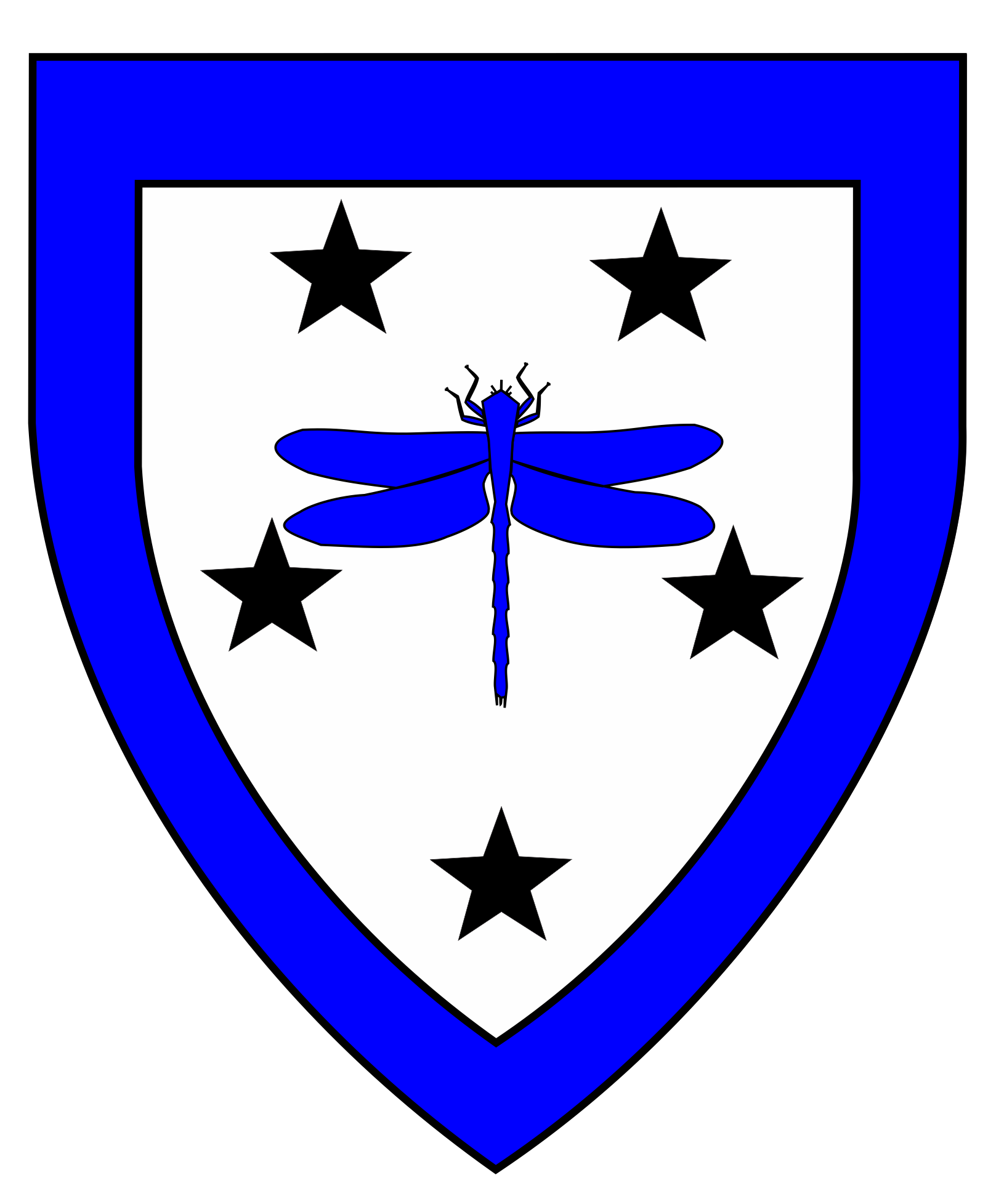 Argent, a dragonfly azure between five mullets, two, two and one, sable, a bordure azure.