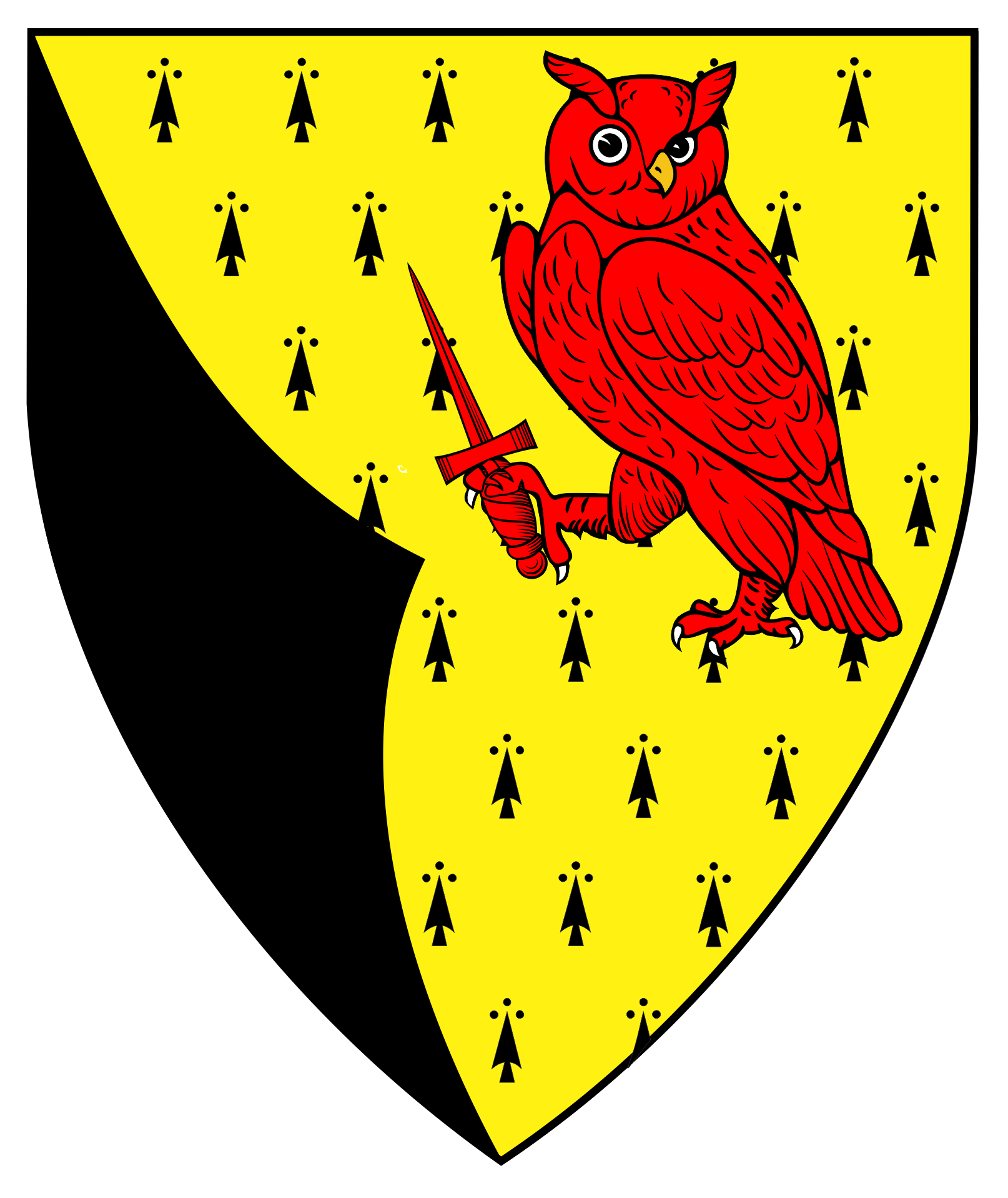 Erminois, an owl maintaining a dagger gules, a gore sable.