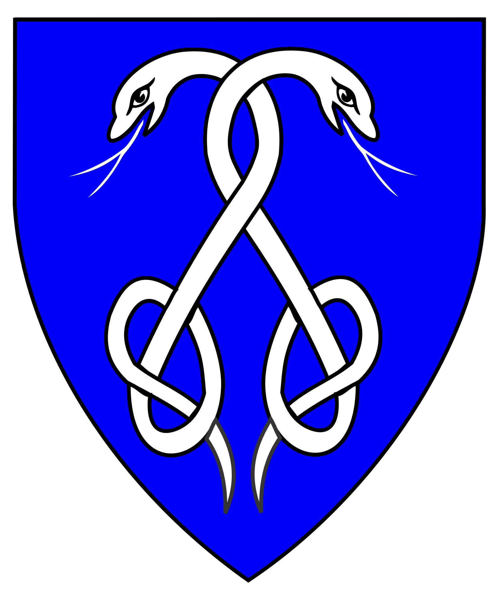 Azure, two snakes palewise tails nowed entwined at the necks argent.