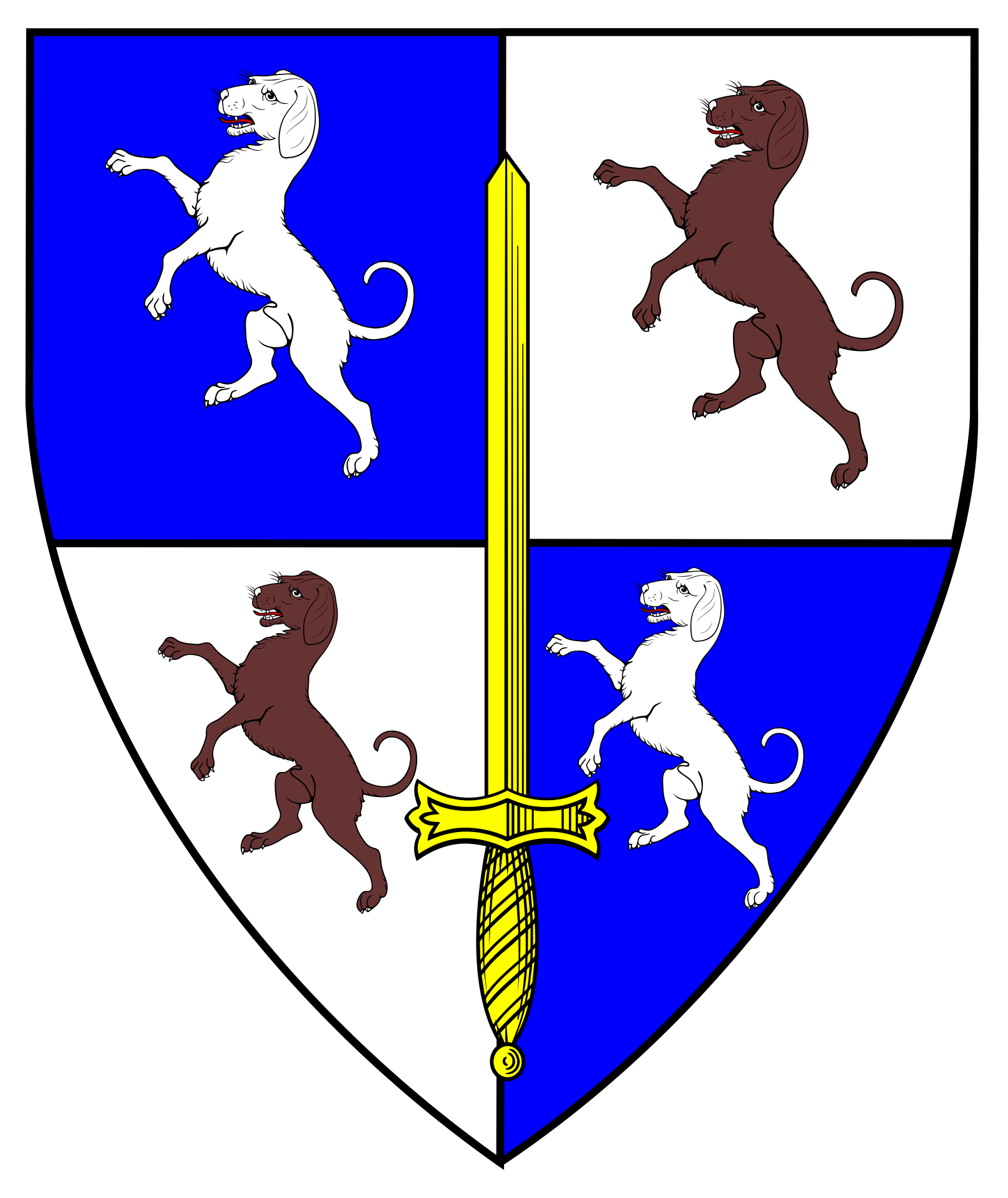 Quarterly azure and argent, a sword Or between in bend two hounds rampant argent and in bend sinister two brown hounds rampant proper.