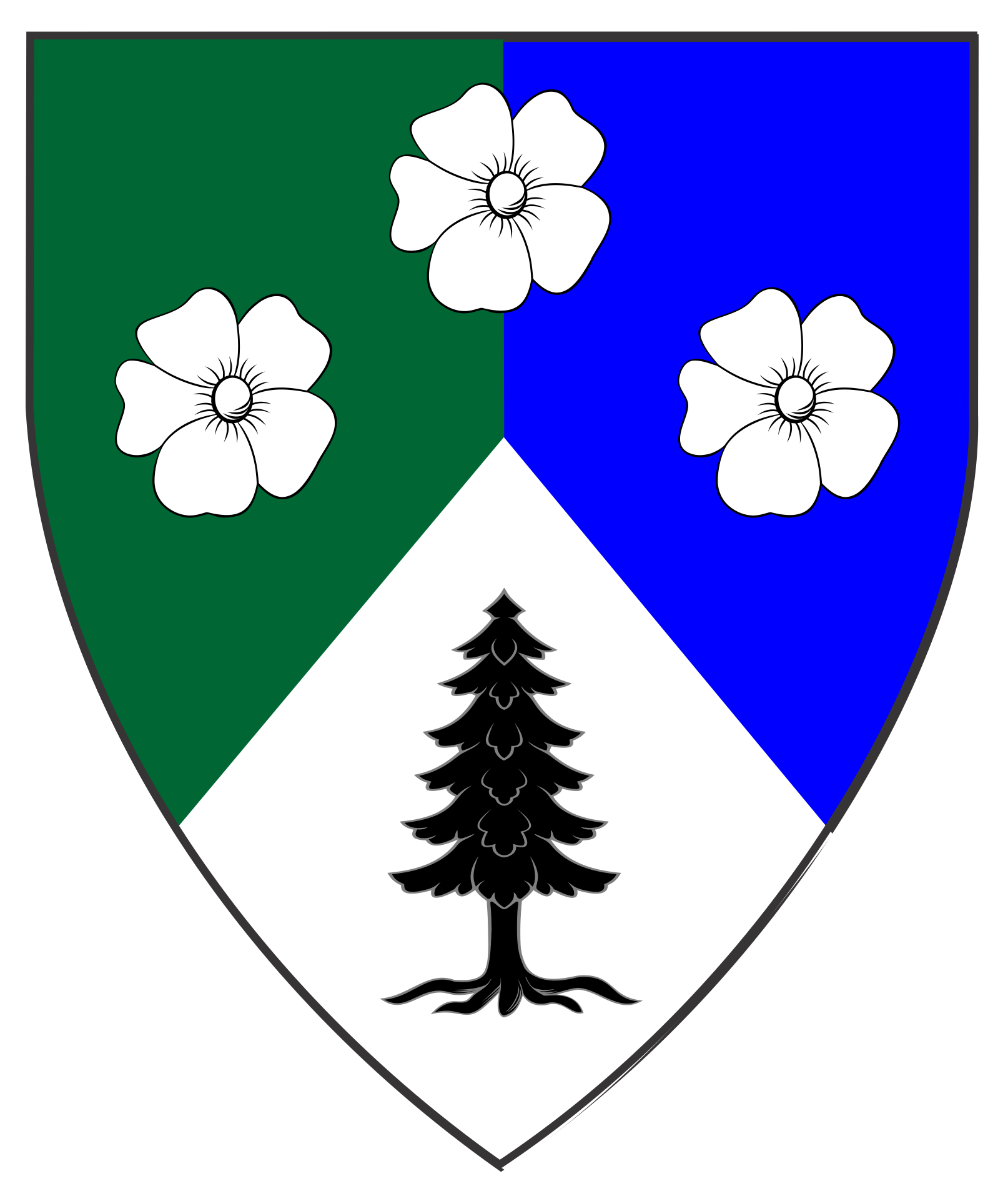 Per pall inverted vert, azure, and argent, in cross three forget-me-nots argent and a pine tree sable.