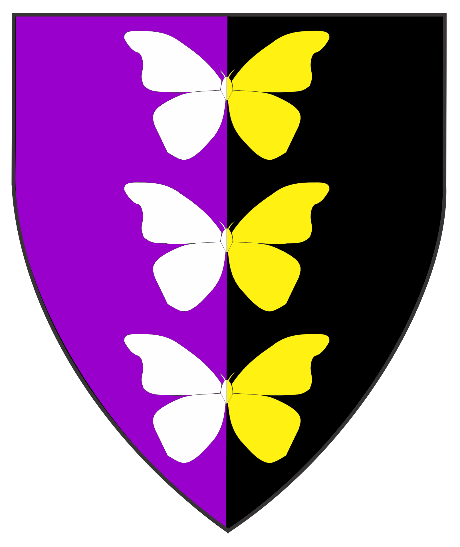 Per pale purpure and sable, in pale three butterflies counterchanged argent and Or.