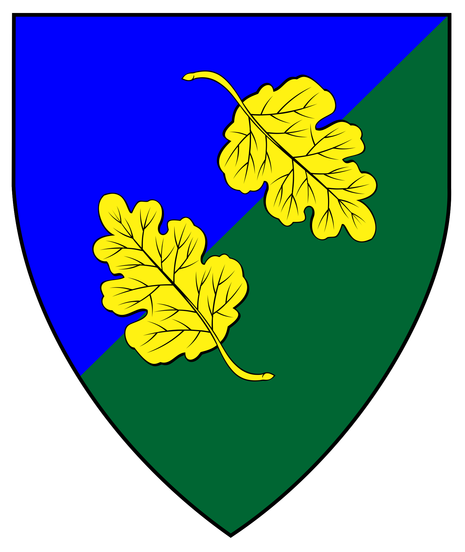 Per bend sinister azure and vert, in bend sinister an oak leaf bendwise inverted and an oak leaf bendwise Or.