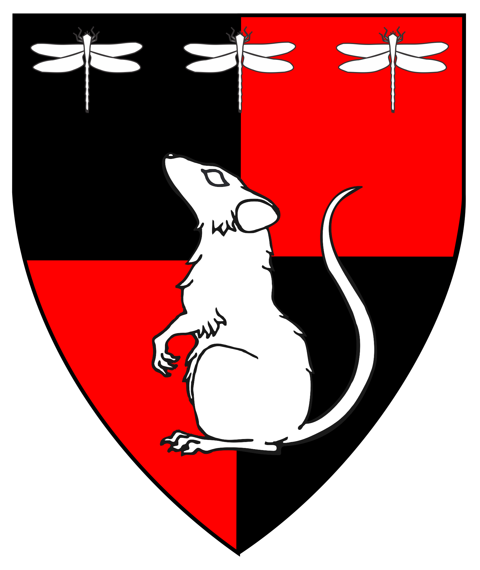 Quarterly sable and gules, a mouse sejant erect, in chief three dragonflies argent.