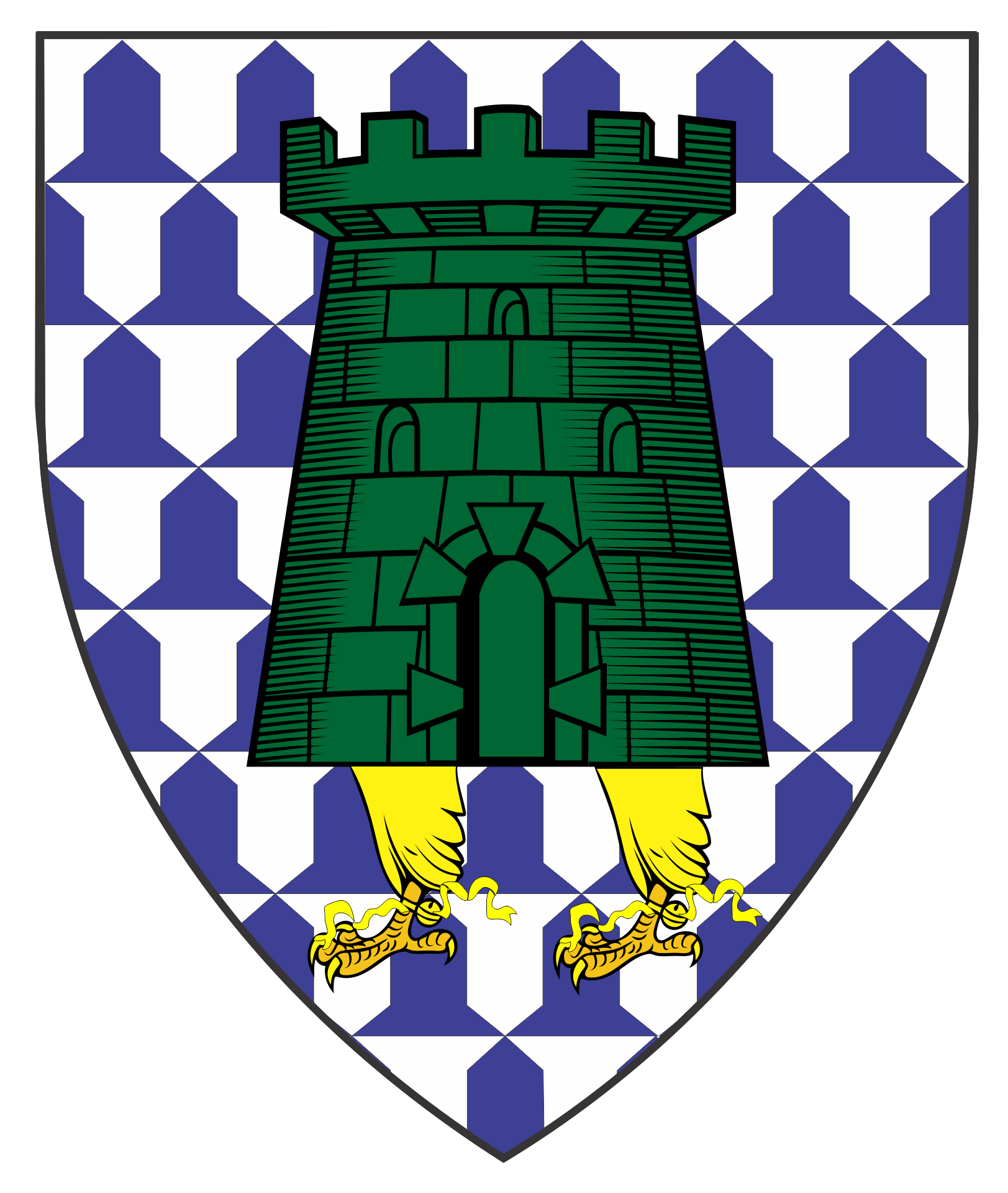 Vair, issuant to base from a tower vert two falcon's legs belled and jessed Or.