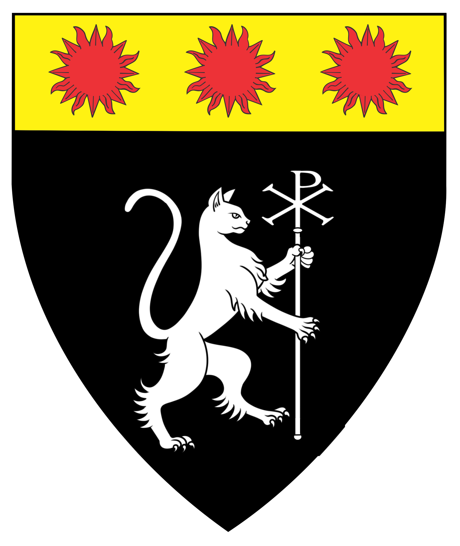 Sable, a domestic cat rampant contourny maintaining a staff ensigned with a chi-rho argent, on a chief Or three suns gules.