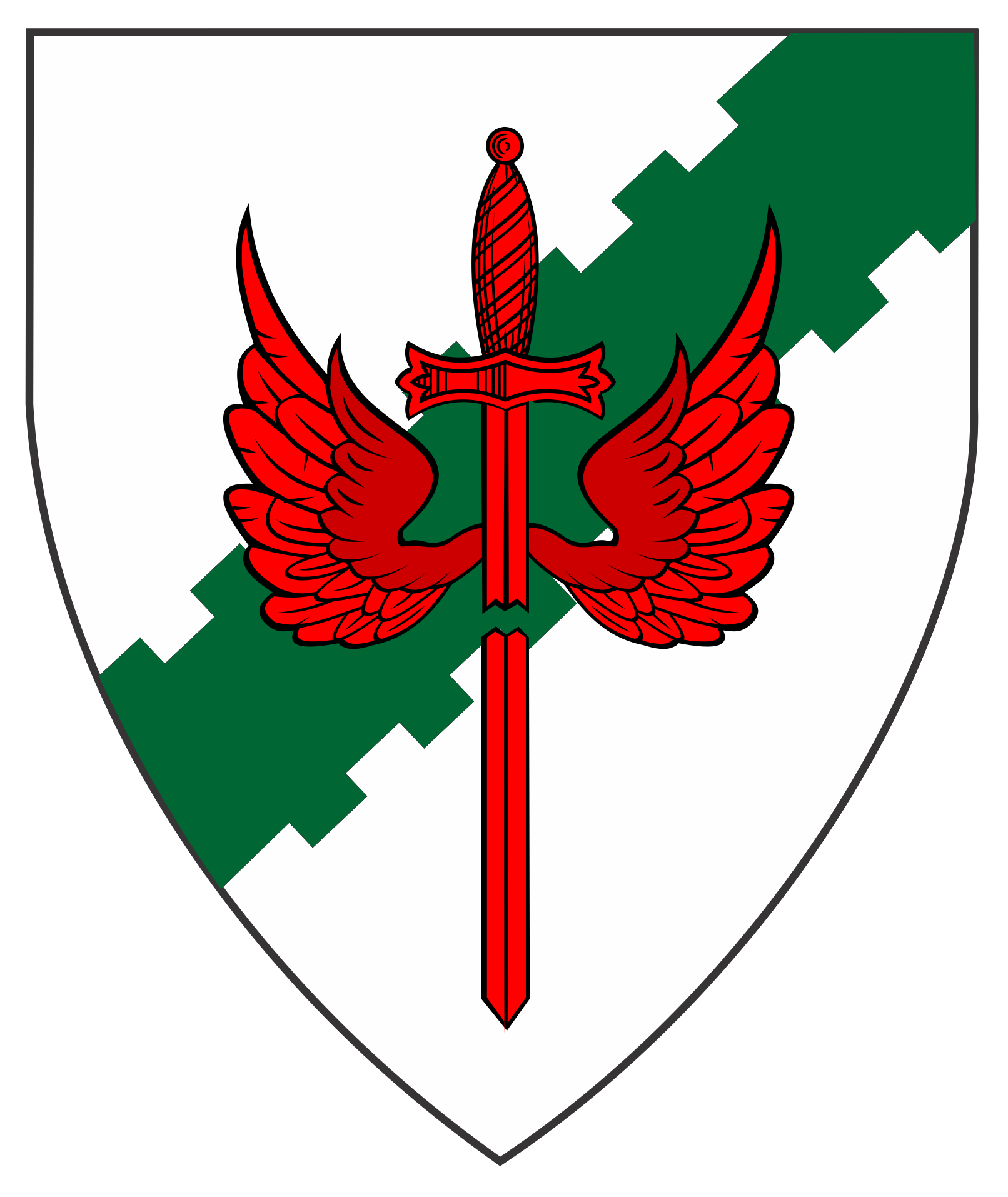 Argent, a bend sinister embattled counter-embattled vert, overall a winged sword fracted and inverted gules.