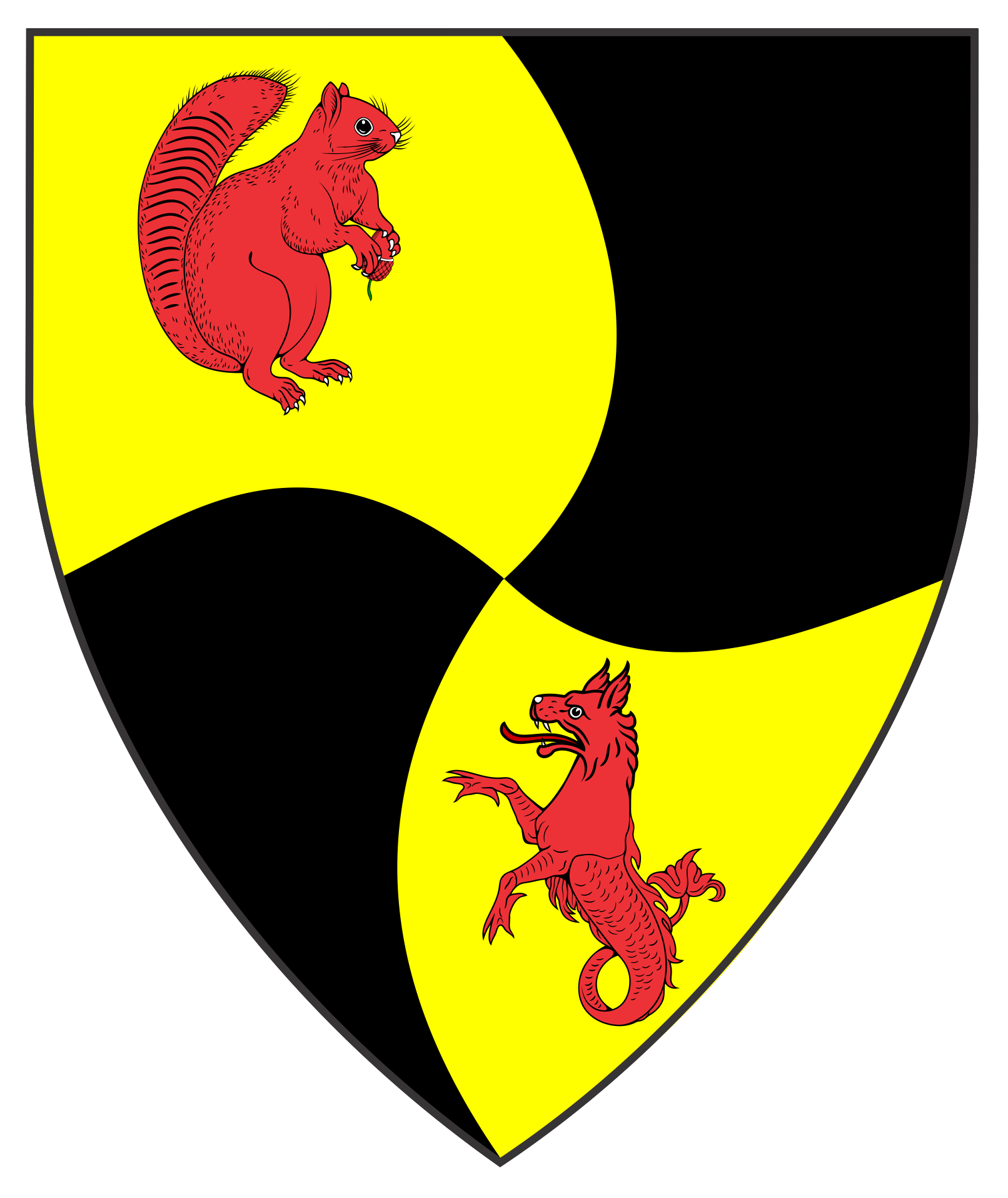 Quarterly arrondi Or and sable, a squirrel contourny maintaining an acorn and a sea-wolf gules.