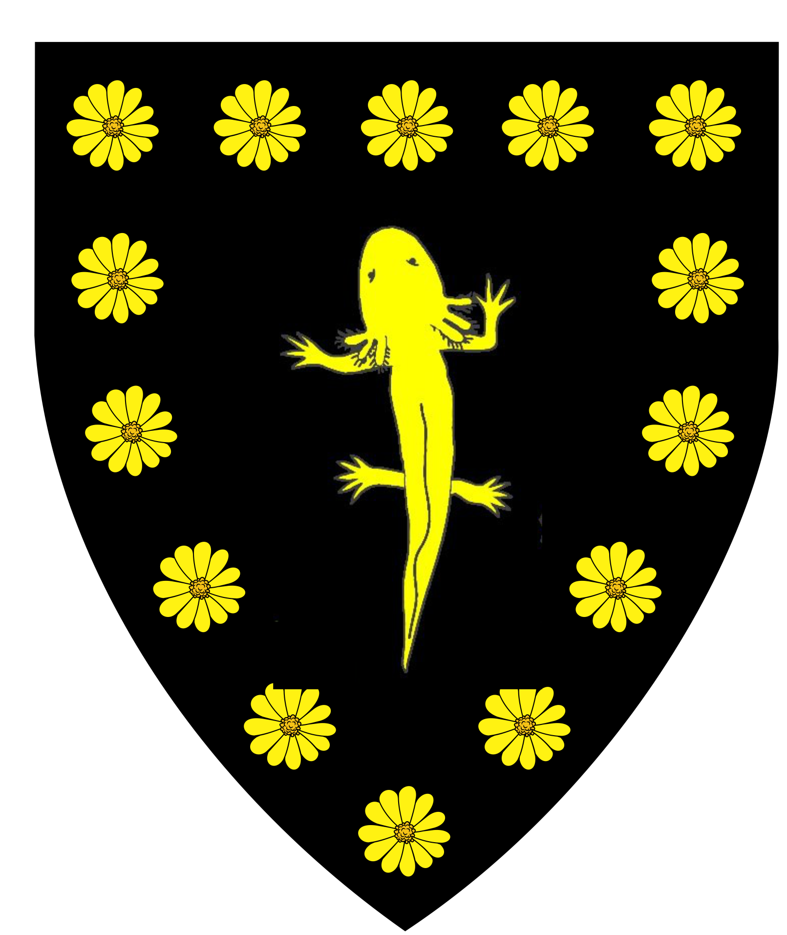 Sable, an axolotl tergiant within an orle of marigolds Or.
