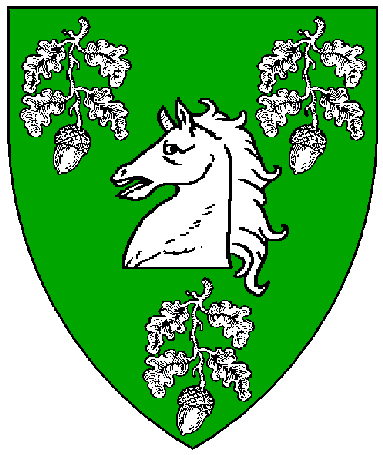 Vert, a horse's head couped between three acorns slipped and doubly-leaved argent.