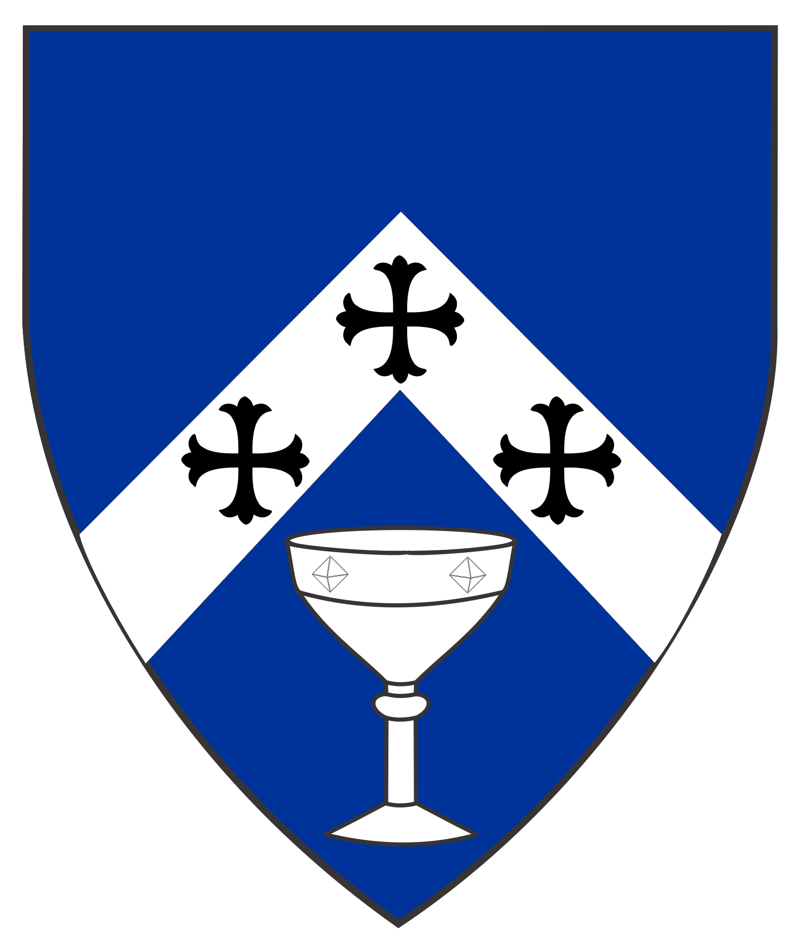 Azure, on a chevron argent three crosses patonce palewise sable, in base a goblet argent.