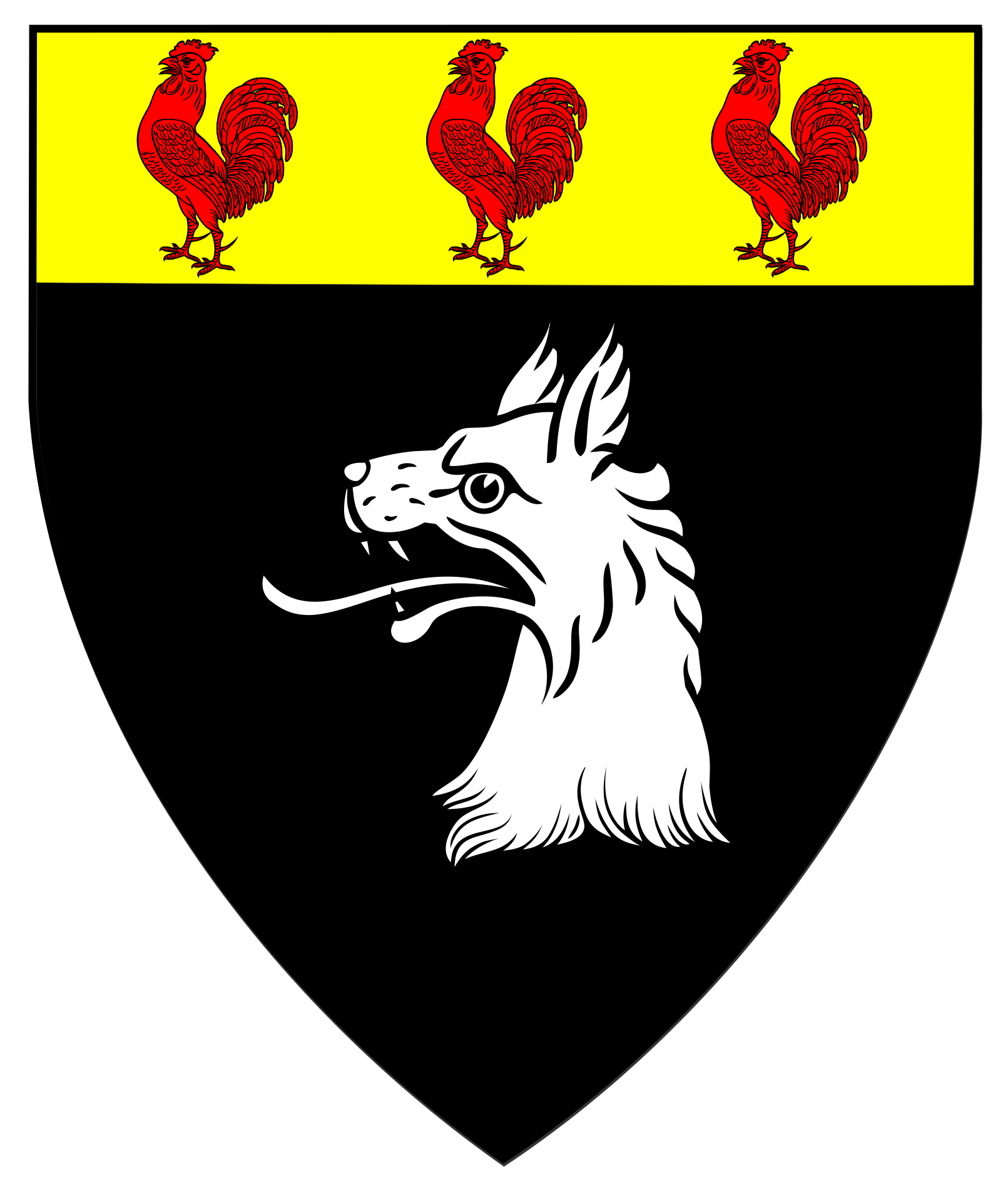 Sable, a wolf's head erased argent, on a chief Or three dunghill cocks gules.